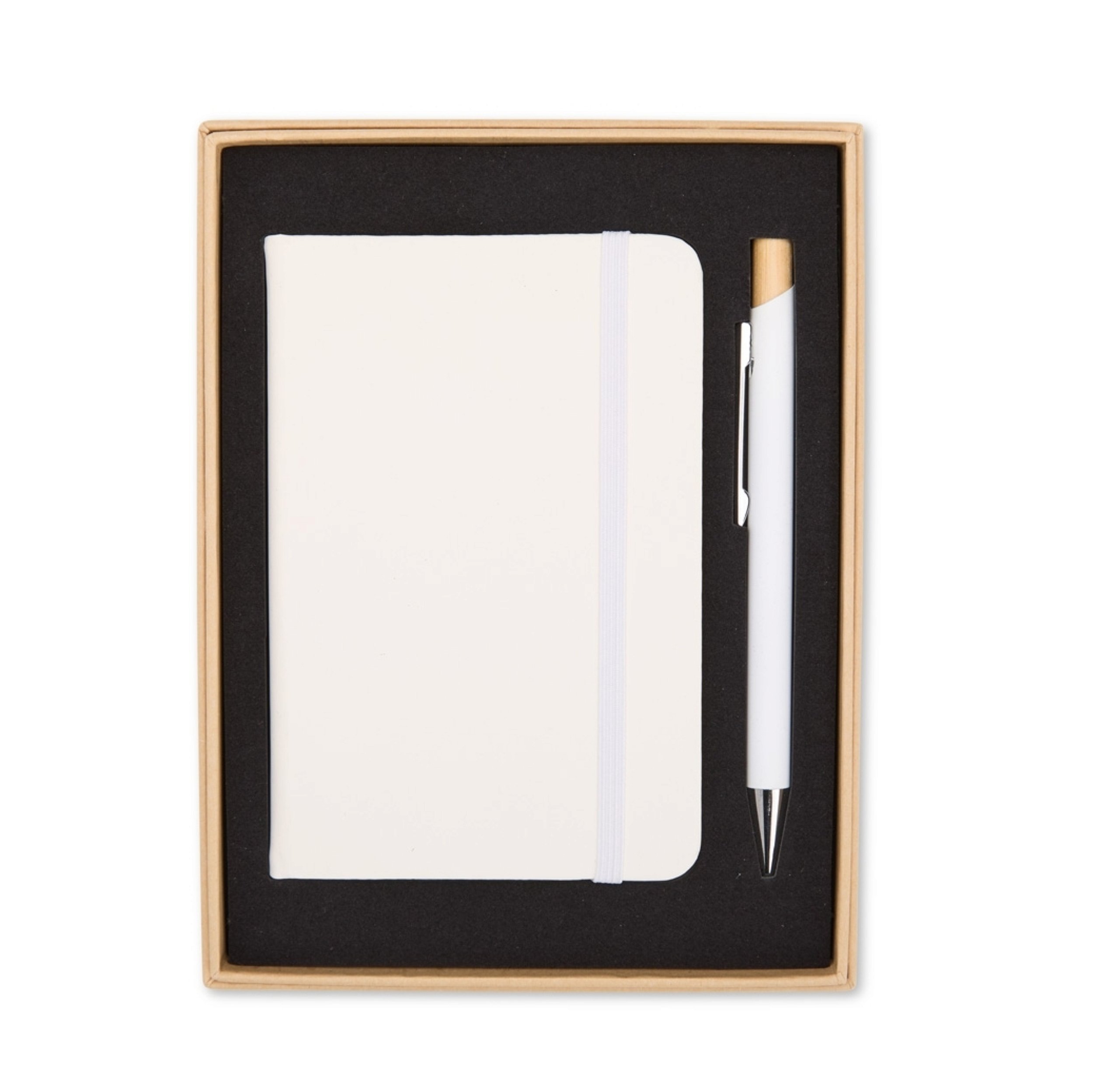 Kit executivo composto por uma caderneta e uma caneta. A caderneta possui capa dura em couro sintético, marca-páginas em fita de cetim e elástico para fechamento, além de aproximadamente 80 folhas com pauta. A caneta metálica conta com detalhe em bambu, acionamento por clique e carga esferográfica azul de 1,0mm. Acompanha uma caixa de papelão com berço interno em espuma.